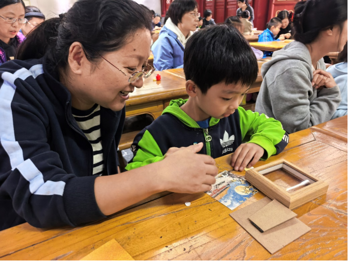 明伦堂内其乐融融,讲师向大家展示文庙“拾秋”的银杏叶、栾树果实等,一草一木,皆为润物无声的文化注脚。孩子们发挥奇思妙想,将“拾秋”得来的枝叶花果与代表团圆吉祥的干桂花放在一起,精心布局,一幅幅融合秋日意蕴与自然元素的中秋相框便跃然眼前。孩子们举着自己创作的相框,用稚嫩真诚的语言表达着对家人的爱和感谢。