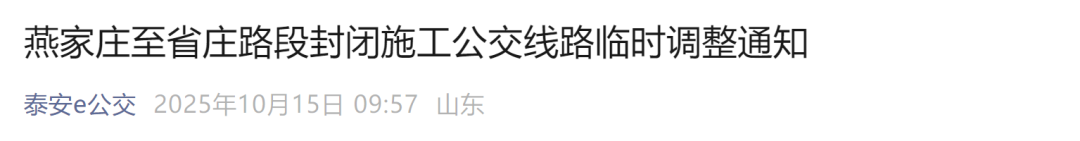 10月15日,泰安e公交微信公众号发布燕家庄至省庄路段封闭施工公交线路临时调整通知,详情如下: