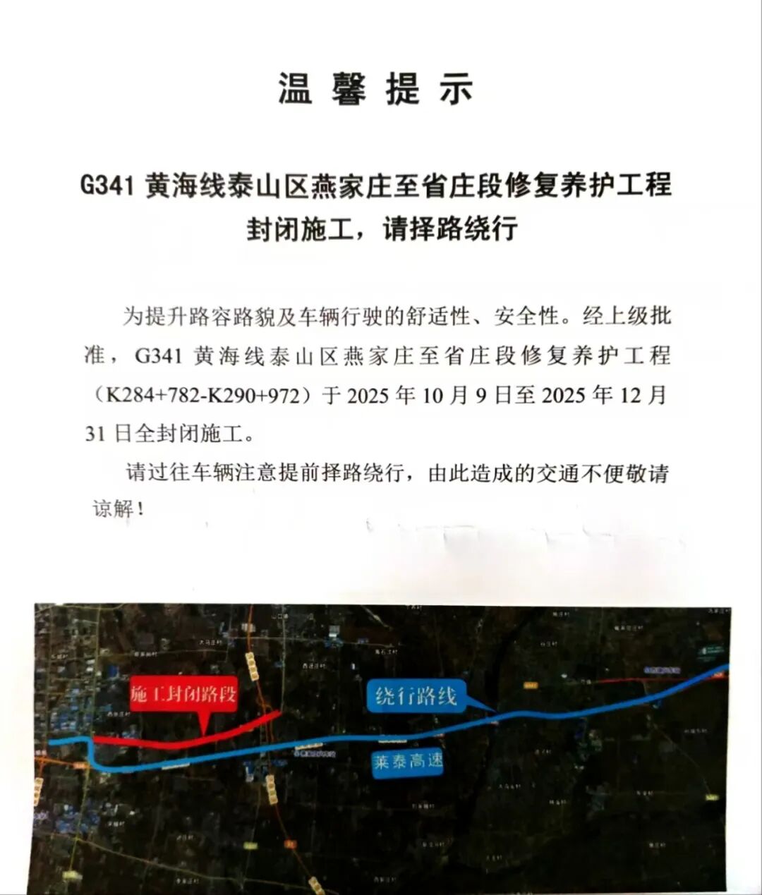 接有关部门通知,G341黄海线燕家庄至省庄路段修复养护工程,2025年10月9日至2025年12月31日全封闭施工,部分公交线路受到影响,需进行临时调整,绕路情况和停靠站点如下: