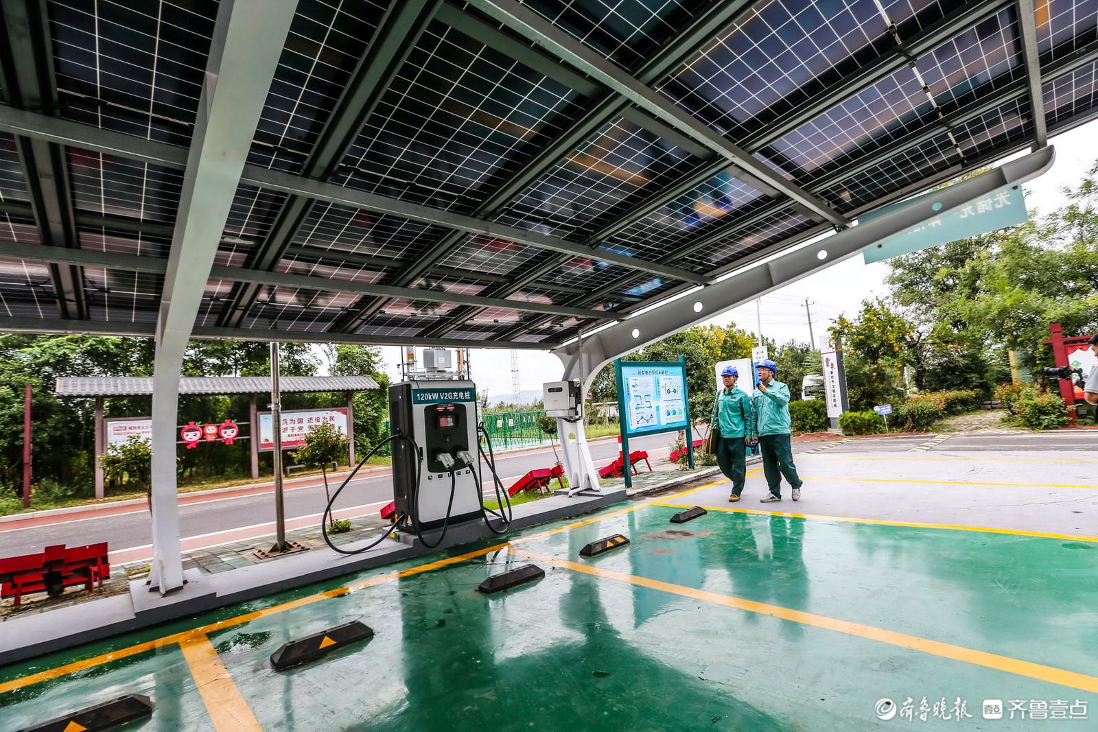 “‘绿车充绿电’是将新能源汽车与可再生能源电力相结合的新型服务业态,助力实现碳减排。”国网枣庄供电公司运检部专责曹璐介绍说,贾泉村位于万亩榴园景区中心位置,现由4台变压器供电,户均容量为4.06千伏安,供电半径为330米,用电客户295户。贾泉村充电站是枣庄供电公司试点建成的首个乡村光储充一体化便民充电站,集光储充放检于一体,顶棚为16.2千瓦光伏发电板,下面安装120千瓦车网互动直流桩2台,配套100千瓦/200千瓦时储能装置一套,附近落点5千瓦风力发电机一台,通过“光伏、风电+储能+智能调度”微电网技术,实现充电桩24小时不间断绿电供应。