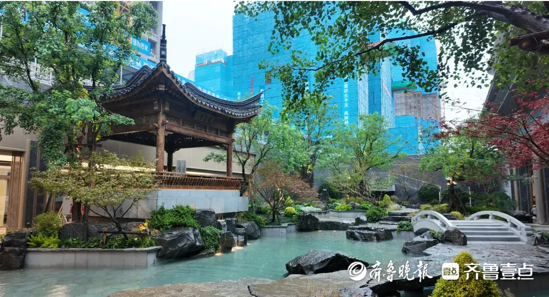 穿过售楼处,“临泉十二境”的宋韵园林示范区,正是试点项目“绿色生态”要求的生动诠释。入口“寻泉”的叠水景观与黑松相映,“望泉”台地的状元亭复刻文人雅集盛景,“听泉”溪谷的潺潺流水呼应地域文脉。这片融入自然的园林空间,不仅实现了建筑与景观的共生共融,更契合了高品质住宅对生态宜居的核心追求,让考察团在步移景异中感受绿色标准的落地实践。