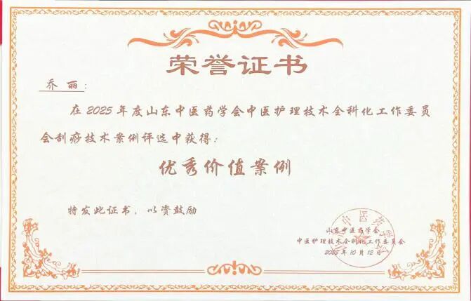 委员会从全省50余家医疗机构近100个案例进行评选,共有20个项目被推荐为2025年度“中医护理技术(刮痧)优秀价值案例”,11个特色项目通过中医护理技术集市形式进行示范推广。临沂市中医医院高铁院区中医外治中心副护士长乔丽的刮痧临床应用案例《基于抑木扶土理论指导下的刮痧疗法调理儿童抽动障碍案例分享》被评为2025年度“中医护理技术(刮痧)优秀价值案例”并进行展示。
