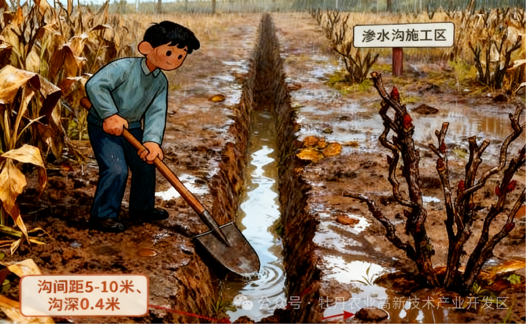 尽快开挖渗水沟,沟深不低于0.4米,沟间距控制在5-10米。
