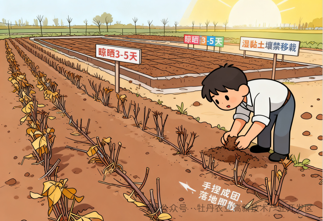 避免在土壤湿黏时开展移栽作业,等待天气放晴后,晾晒3-5天,土壤达到“手捏成团、落地即散”状态为宜。