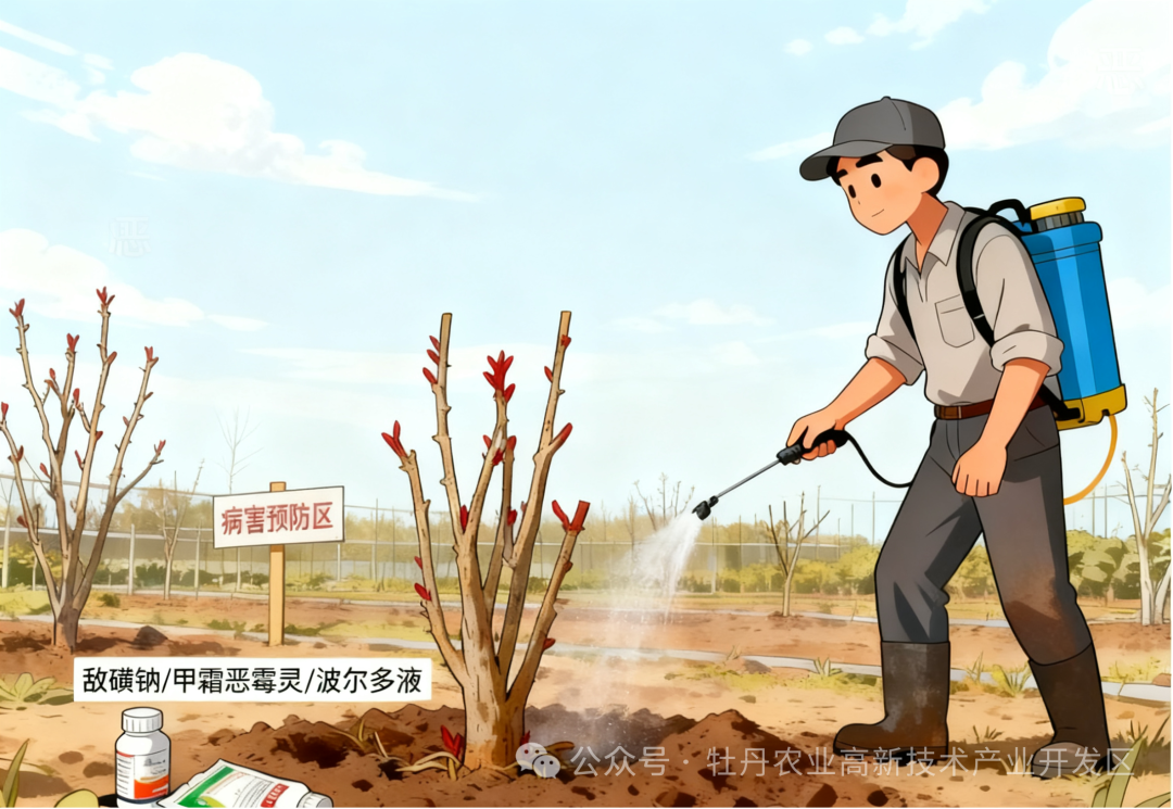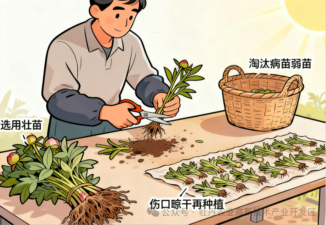 选用健壮、无病虫害大苗移栽,芍药分株避免过大伤口,淘汰病苗、弱苗;