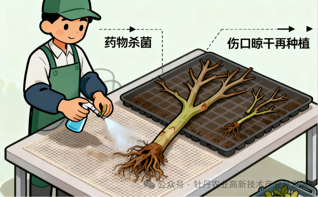 移栽前,必须对种苗进行药物杀菌处理,待伤口晾干后再行种植,避免带菌移栽。适当修剪受损的枝叶和烂根,以减少水分蒸发和养分消耗。