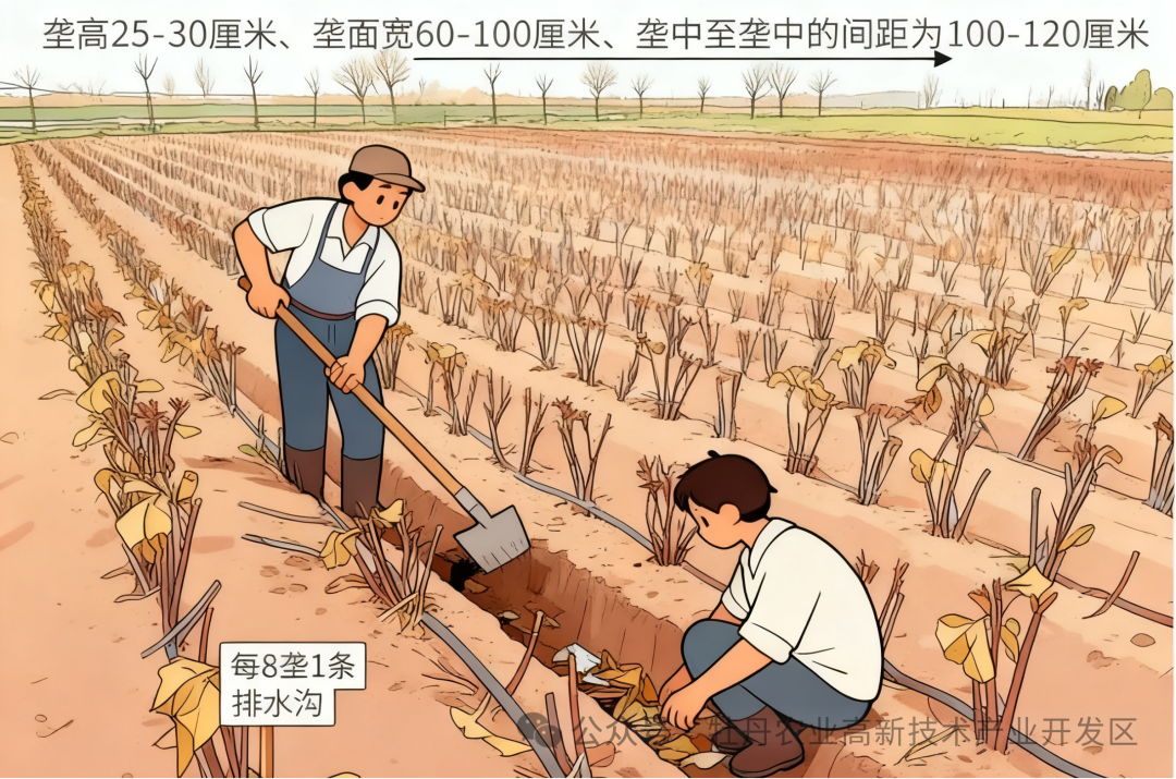 移栽时采用起垄种植,垄高25-30厘米、垄面宽60-100厘米、垄中至垄中的间距为100-120厘米,每8垄开挖一条排水沟。