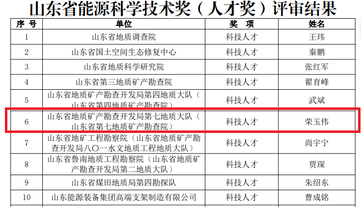 近日,2025年度山东能源科学技术奖获奖名单正式公布,山东省地矿局第七地质大队在此次评选中表现突出,“鲁中南山前平原浅层地热能资源评价及示范应用” 项目获一等奖,荣玉伟荣获“优秀科技工作者”称号。