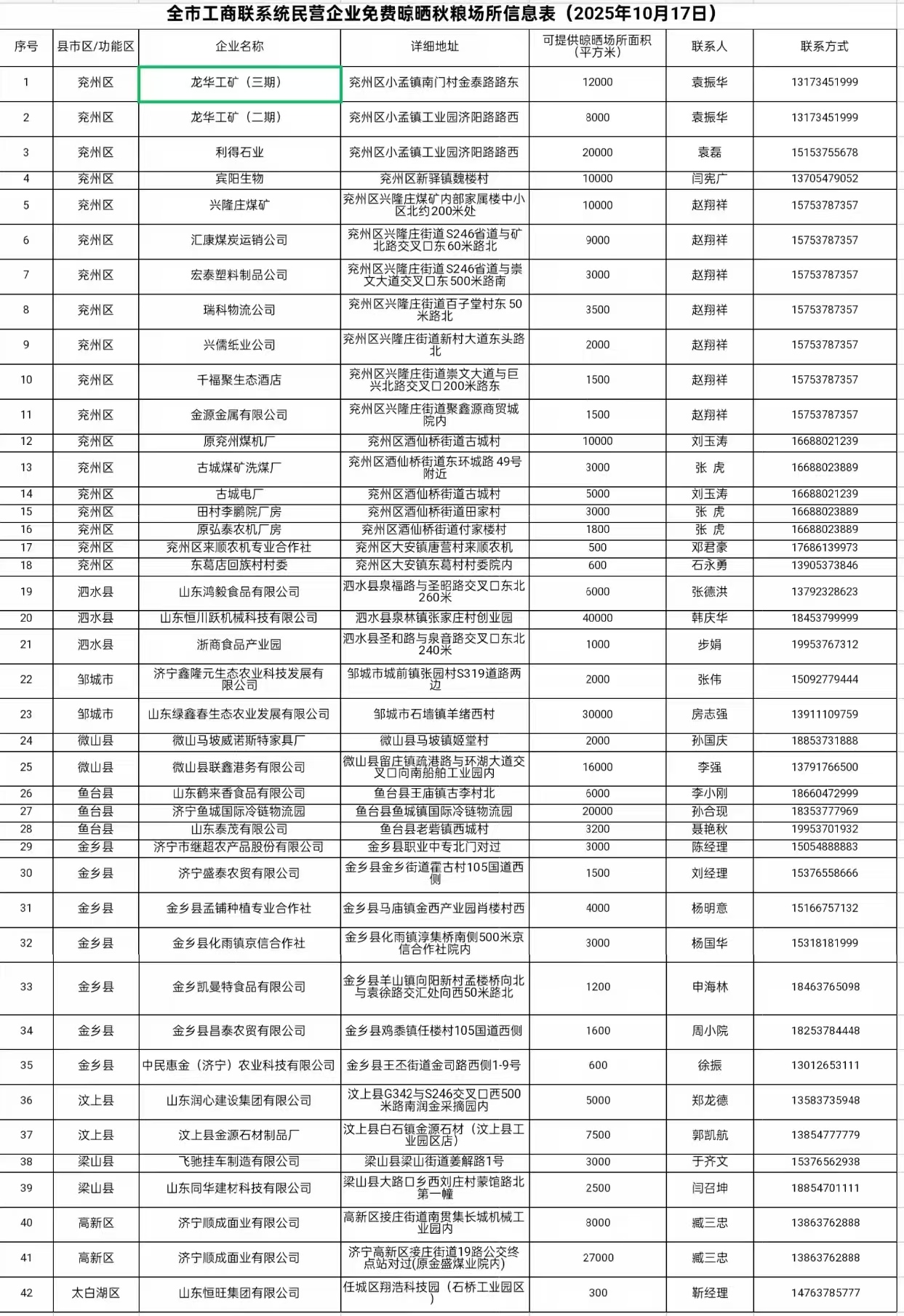 济宁市工商联全力配合市农业农村部门工作,在其号召下,全市工商联系统积极发动民营企业展现责任担当,开放企业空闲的厂房、场地,免费为农户提供粮食晾晒服务,全力协助秋粮抢收,现将第一批(10个县市区)42处场地详细信息公布如下。