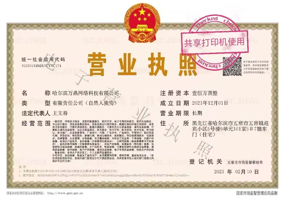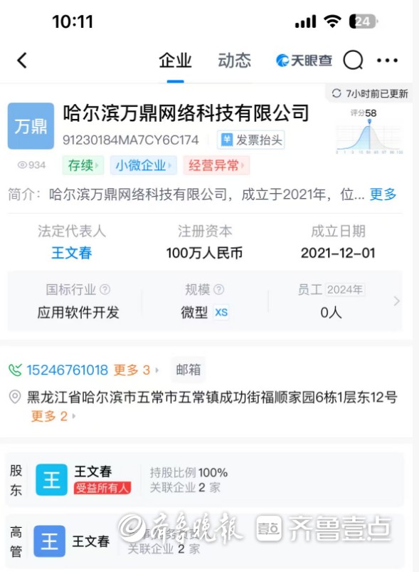 记者通过天眼查查询“哈尔滨万鼎网络科技有限公司”,显示该企业被五常市市场监管局列为经营异常,原因为通过登记的住所或经营场所无法联系。记者企业预留电话联系,对方表示登记错误。