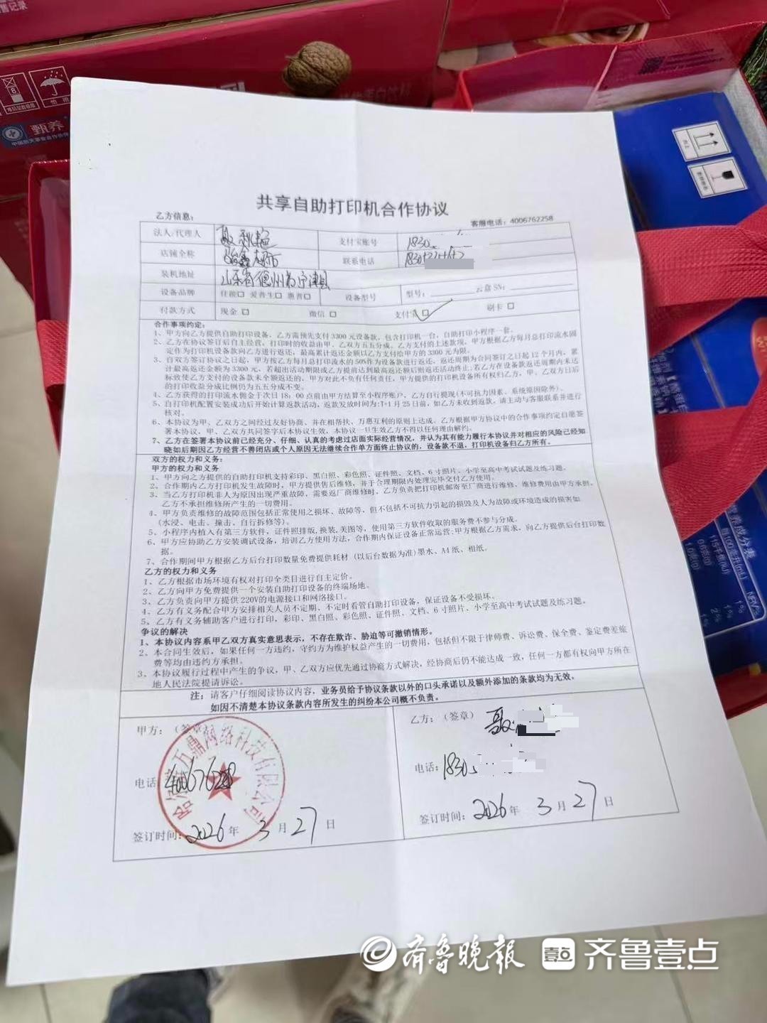 聂女士回忆,3月27日下午两点半左右,三名身穿蓝色工装的推销人员来到她的超市,自称是推广共享打印机业务。对方表示,打印机及纸墨等耗材均由厂家提供,店方只需提供摆放位置、电源和网络,打印收入双方五五分成。