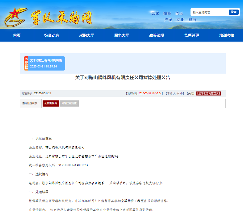 暂停处理公告显示,鞍山钢峰风机的违规情况为:经调查,鞍山钢峰风机在参加采购活动中,涉嫌存在违规失信行为。