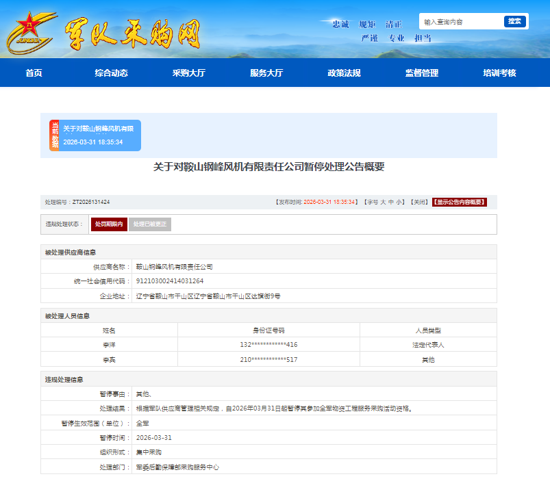 据悉,处理部门根据军队供应商管理相关规定,自2026年3月31日起暂停其参加全军物资工程服务采购活动资格。在暂停期内,其法定代表人李洋控股或管理的其他企业暂停参加上述范围军队采购活动。处理编号:ZT2026131424。违规处理状态:处罚期限内。