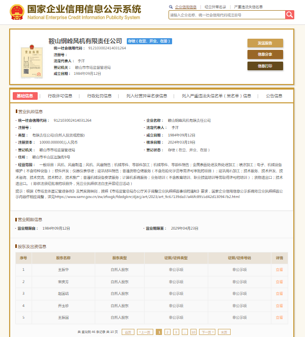 国家企业信用信息公示系统显示,鞍山钢峰风机有限责任公司成立于1984年,法定代表人李洋,注册资本10000万元人民币,大股东为李成林。